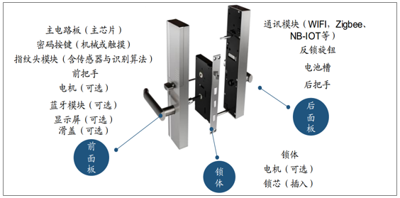 從物理結(jié)構(gòu)上,智能門鎖通常可以分為三部分:前面板、鎖體、后面板;主要零部件包括鎖體、指紋頭(或密碼按鍵)、主電路板、通信模塊等。